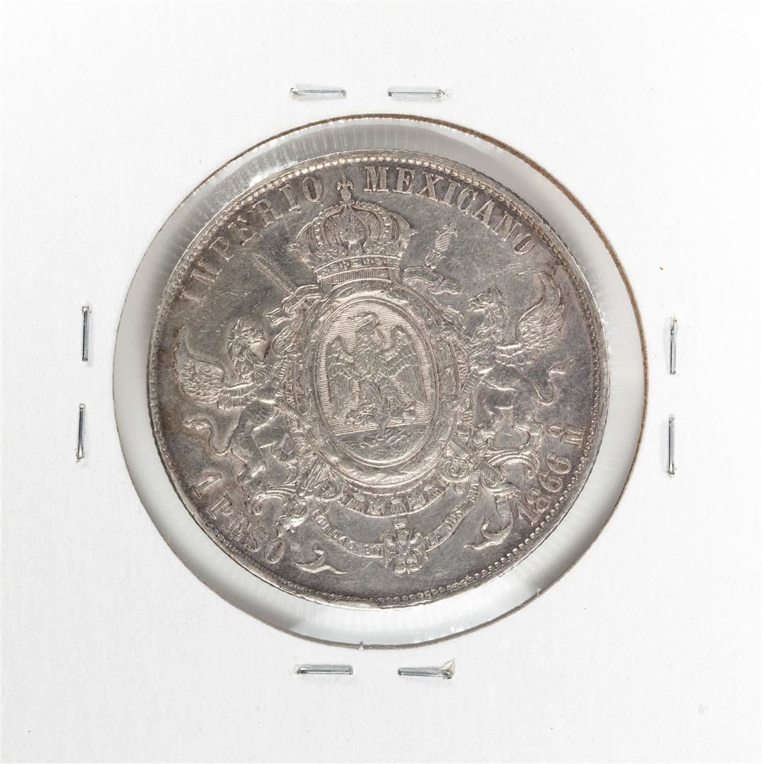 One 1866 Mexico Peso Emperor Maximilian Silver Coin.