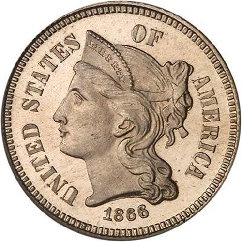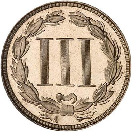 The new coin was an instant hit with the citizenry, and circulation mintage was relatively large during the rest of 1865 and well into 1866; during 1867 and 1868 there still was a substantial coinage, but after that the public lost interest and striking declined. Proofs in these early years were consistent at just below 1,000 pieces, with now and then a pop above. The major reason for the later lack of interest in this denomination was the introduction of another new coin: the shield five-cent piece or "nickel" in 1866. Although the coinage of three cent pieces was reasonably heavy, production fell off dramatically in later years, although Proof production increased three-fold with new collectors. (#93762)
