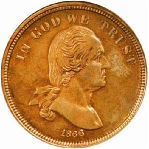 <style type="text/css"> body, td, th { font-family: Arial, Helvetica, sans-serif; font-size: 12px; color: #482424; margin: 0px; padding: 0px; } #header { background-image: url(http://www.bowersandmerena.com/ebay/images/template_v3_01.gif); clear: both; background-color: #590303; border-top-width: 2px; border-top-style: solid; border-top-color: #B38C4F;}#header #header_wrapper { height: 75px; clear: both; width: 800px; margin-right: auto; margin-left: auto; background-image: url(http://www.bowersandmerena.com/ebay/images/template_v3_03.gif); background-repeat: no-repeat; background-position: right; color: #F3EDCC;}#header #header_wrapper #header_logo { float: left; height: 75px; width: 444px; background-image: url(http://www.bowersandmerena.com/ebay/images/template_v3_02.gif); background-repeat: no-repeat; font-size: 10px; text-transform: capitalize; color: #B38C4F;}#header #header_wrapper #header_right { float: left; height: 75px; width: 356px; text-align: right;}#header #header_wrapper #header_right #headerLoginBtn { margin-bottom: 30px;}#header #header_wrapper #header_right input#txtSearch { color: #B49056; border: 1px solid #B49056; width: 175px; padding-top: 3px; padding-right: 3px; padding-bottom: 4px; padding-left: 3px;}#nav { height: 37px; background-image: url(http://www.bowersandmerena.com/ebay/images/template_v3_05.gif); clear: both;}#nav #nav_wrapper { height: 35px; width: 800px; margin-right: auto; margin-left: auto; border-left-width: 1px; border-left-style: solid; border-left-color: #B38C4F;}#nav #nav_wrapper a { padding-right: 15px; padding-left: 15px; border-right-width: 1px; border-right-style: solid; border-right-color: #B38C4F; height: 25px; padding-top: 10px; display: block; float: left; text-decoration: none; font-weight: bold; color: #5D0303;}#nav #nav_wrapper a:hover { color: #B38C4F;}#nav #nav_wrapper #search { float: right; padding-top: 7px;}#nav #nav_wrapper #search #txtSearch { font-family: Arial, Helvetica, sans-serif; font-size: 10px; text-transform: uppercase; color: #D2AE75; border: 1px solid #B38C4F; padding: 3px;}#content_bgd { background-image: url(http://www.bowersandmerena.com/ebay/images/template_v3_09.gif); background-repeat: repeat-y; background-position: center; padding-top: 15px; padding-bottom: 15px; background-color: #FBFBDB;}#content_wrapper { clear: both; height: auto; width: 800px; margin-right: auto; margin-left: auto;}.LotDetailWhite{ line-height:normal; font-size:13px; font-family: arial,helvetica,sans-serif; color: White; font-weight: bold;}.LotDetailInformation{ line-height:normal; font-size: 13px; font-family: arial,helvetica,sans-serif;}.LotDetailMessage{ line-height:normal; font-size: 13px; font-family: arial,helvetica,sans-serif; color: red;}}tr.HeaderAuctionTitle td { color: #000000; font-weight: bold; padding: 2px; background-image: url(http://www.bowersandmerena.com/ebay/images/template_v3_05.gif); background-repeat: repeat-x; border-bottom-width: 1px; border-bottom-style: solid; border-bottom-color: #B38C4F;}table.AuctionSummary a, table.AuctionSummary a:link, table.AuctionSummary a:visited { color: #0000FF; text-decoration: none;}}td.tableHeaderLeft { border-left-width: 1px; border-left-style: solid; border-left-color: #B38C4F;}td.tableHeaderRight { border-right-width: 1px; border-right-style: solid; border-right-color: #B38C4F;}td.tableCellMiddle { border-left-width: 1px; border-left-style: solid; border-left-color: #B38C4F; border-right-width: 1px; border-right-style: solid; border-right-color: #B38C4F; padding: 5px;}tr.footer td { border-top-width: 1px; border-top-style: solid; border-top-color: #B38C4F;}</style></head><body><div id="header"> <div id="header_wrapper"> <div id="header_logo"> </div> <div id="header_right"> </div> </div></div><div id="nav"> <div id="nav_wrapper"> <a href="http://www.bowersandmerena.com">Our eBayLive Auctions</a> <a href="#PaymentInfo">Payment Information</a> <a href="#ShippingInfo">Shipping Information</a> <a href="#About">About Bowers and Merena</a> </div></div><div id="content_bgd"> <div id="content_wrapper"> <table width="100%" border="0" cellpadding="5" cellspacing="0" class="AuctionSummary"> <tbody> <tr class="HeaderAuctionTitle" style="height: 25px;"> <td align="left" class="tableHeaderLeft" > </td> <td align="center" class="tableHeaderRight"> <span style="font-size: large;">Lot #965. 1866 Pattern Five-Cent Piece. Judd-468, Pollock-561. Rarity-8. Proof-63 RD (PCGS).</span> </td> </tr> <tr> <td colspan="3" class="tableCellMiddle"> The obverse depicts the handsome and extremely popular Washington motif with a right-facing bust of our nation's first president as the central design element. The motto IN GOD WE TRUST is above and the date 1866 is below. The reverse has a laurel wreath surrounding the denomination expressed simply as a numeral 5. The legend UNITED STATES OF AMERICA is inscribed along the upper border. Struck in copper with a plain edge.This is one of the most popular types in the entire pattern coinage family, representing as it does one of the earliest uses of a president's portrait on a coin struck in the United States Mint. The year 1866 is of even further significance in numismatics because, among other things, it is the first in which the Mint struck regular-issue "Nickels," or Five-Cent pieces struck in an alloy of copper and nickel. A lovely example of a rare variety, the coin in this lot retains full mint color in rose-red shades. Fully struck and free of singularly mentionable blemishes, the overall appearance is not all that far from what one might expect to see in a Proof-64 numeric grade.