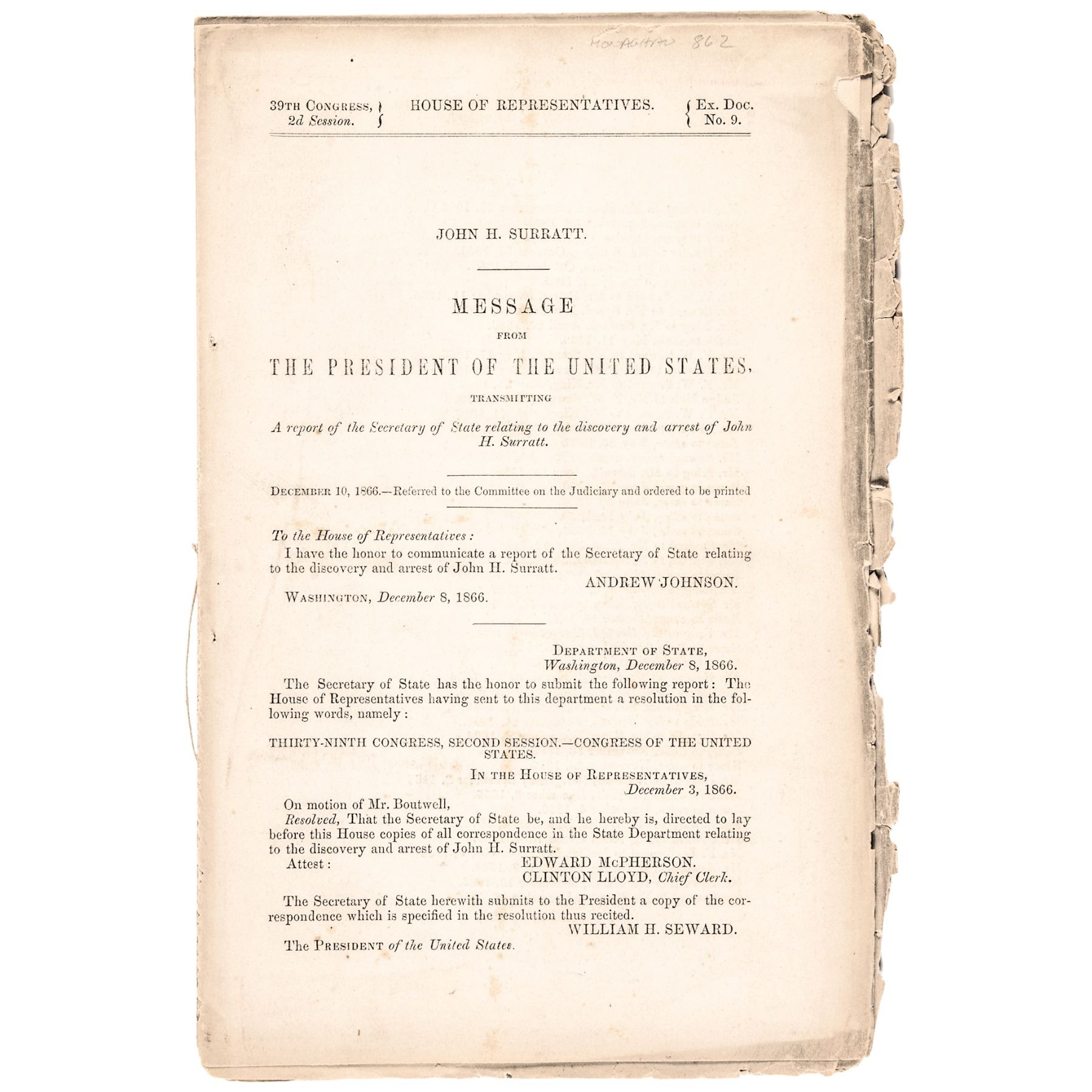 December 10, 1866-Dated Abraham Lincoln Assassination related Historic House of Representatives Report from President Andrew Johnson regarding, "The Discovery And Arrest of John H. Surratt" to Congress, Choice Very Fine.