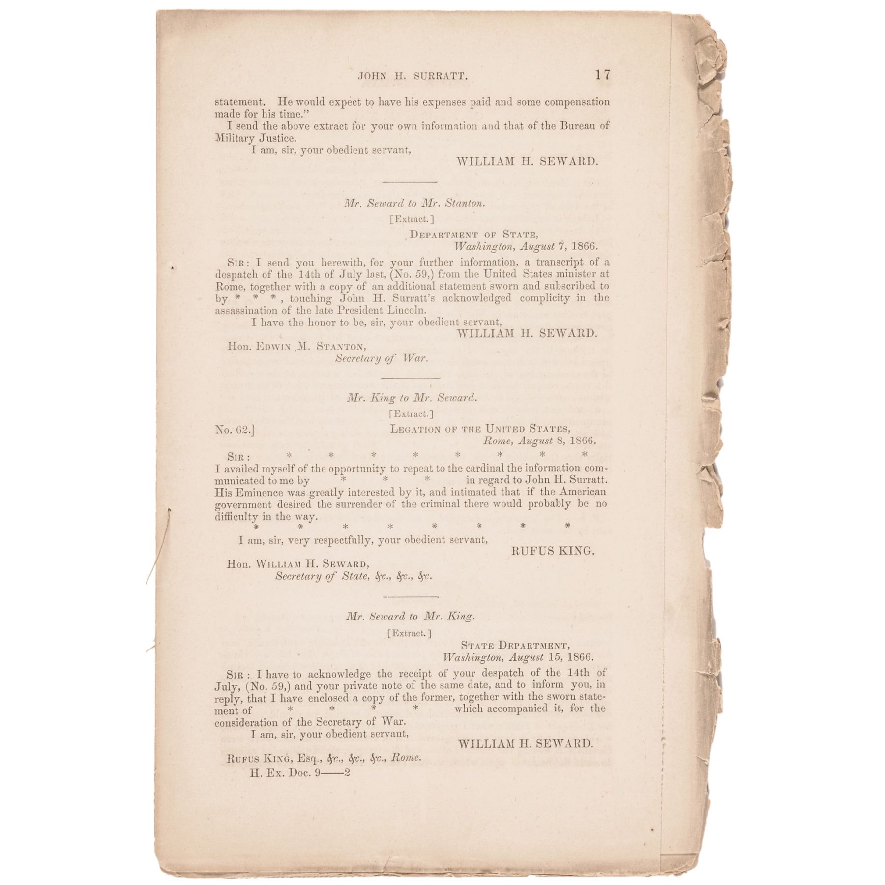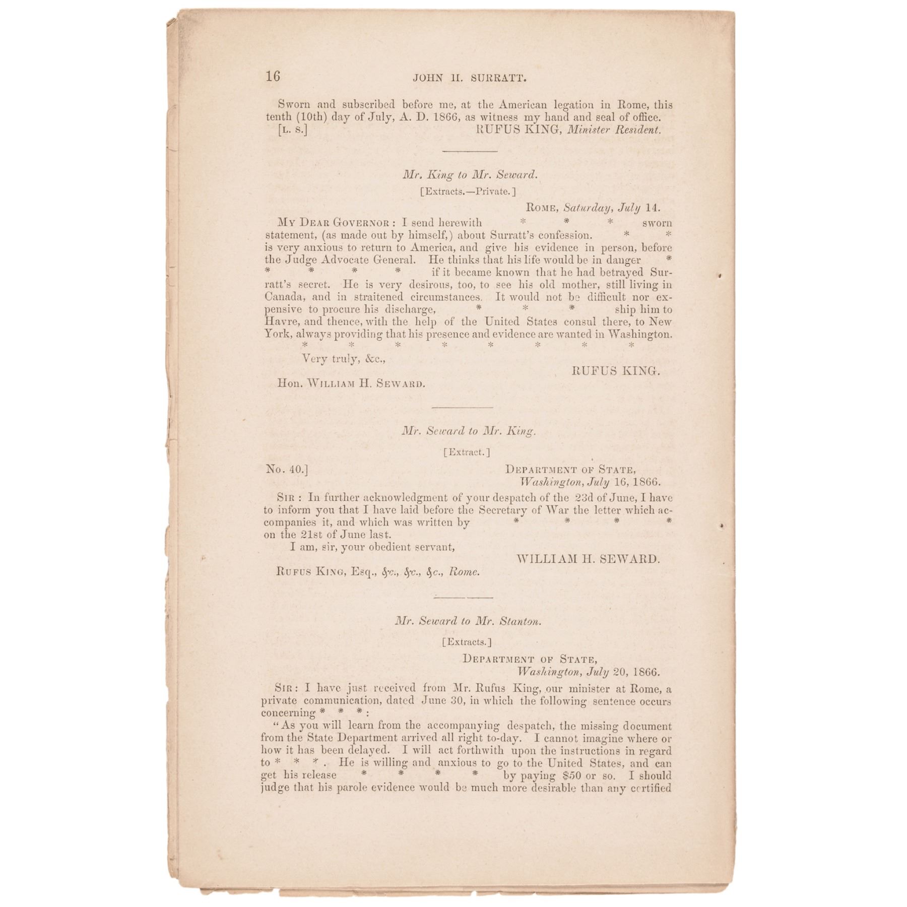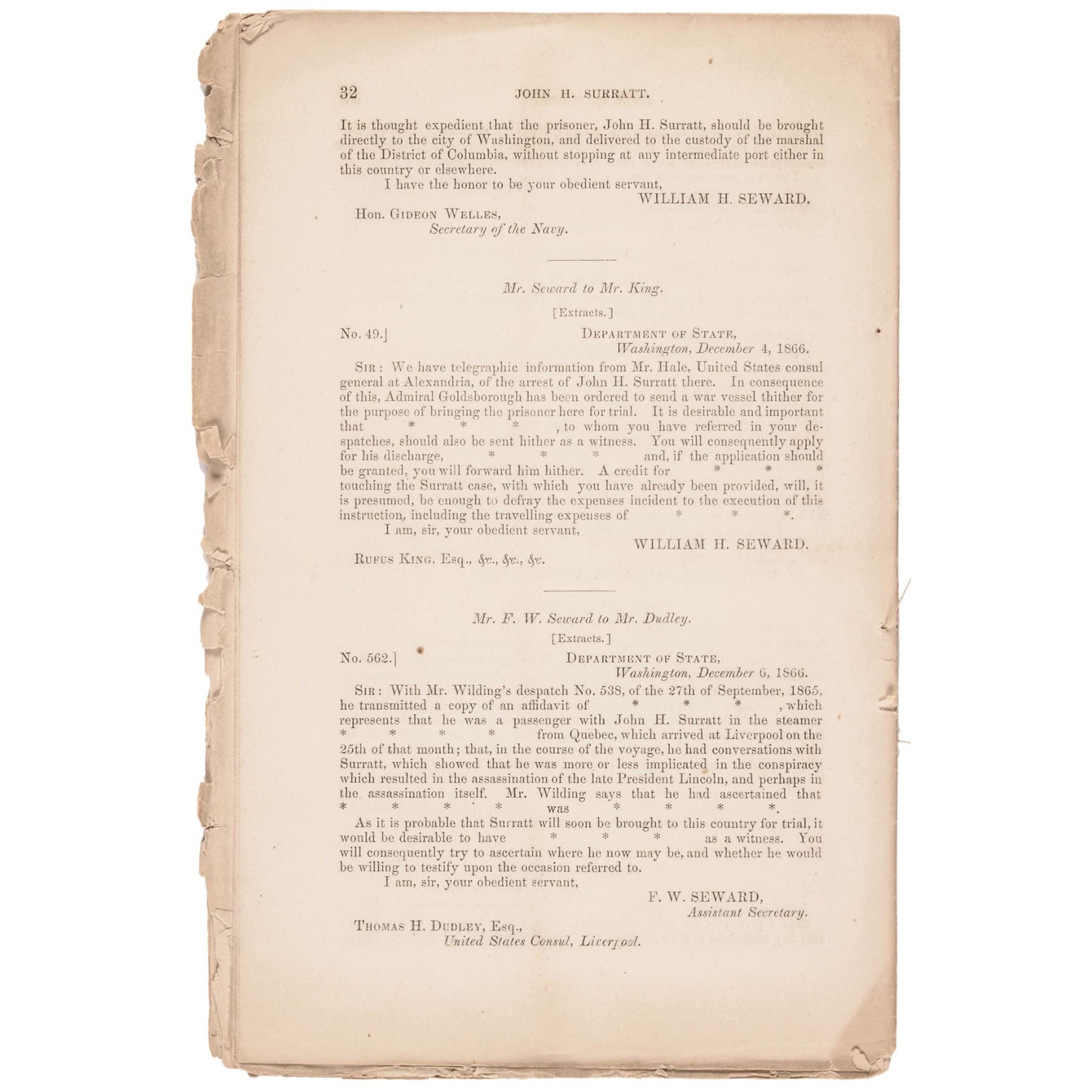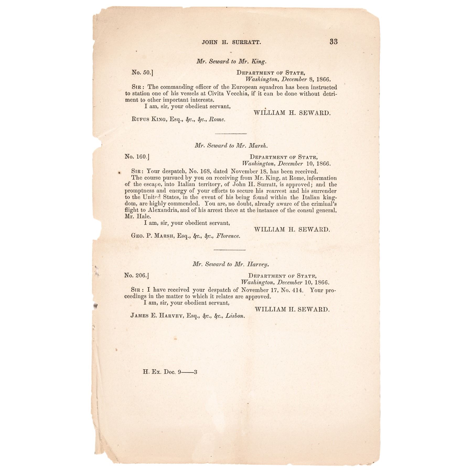 This important historical printed Report is 33 pages in length, measuring 6" x 9.5" with a pleasing appearance. It has its original thread binding present. Some sections and pages are loose and the outer edges are rough with some minor chipping from use. The House of Representatives Report details the discovery and arrest of John H. Surratt (1844-1916). Surratt was accused of plotting with John Wilkes Booth to kidnap President Abraham Lincoln and suspected of involvement in the Lincoln assassination. Surratt avoided arrest immediately after the assassination by fleeing the country. He served briefly as a Papal Zouaves (an infantry force formed in defense of the Papal States) under the name of John Watson before his arrest and extradition (page 7). By the time he returned to the United States, the statute of limitations had expired on most of the potential charges and he was not convicted. A very rare Abraham Lincoln Assassination related material.