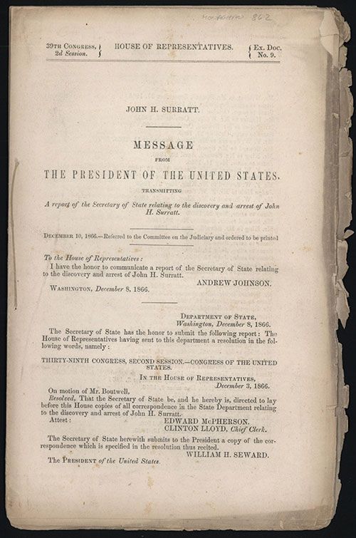 Washington D.C., December 10, 1866, House of Representatives Report relating to Secretary of State William H. Seward's discovery and arrest of John H. Surratt one of the accomplices in Abraham Lincoln's assaination. Report is 6 x 9 inches, some pages are loose, but untrimmed. VG condition. Rare Lincoln related document.