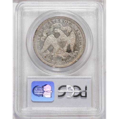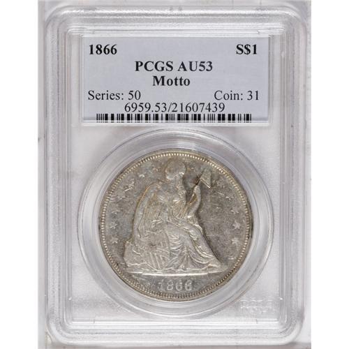 <B>1866<img border='0' src='http://www.heritagecoins.com/images/star.gif' width=10 height=10>$1> Motto AU53 PCGS.</B></I> Lightly worn with substantial reflective luster. Pale champagne patina covers the surfaces with a spot of cherry toning in the right reverse field. Some peripheral weakness is evident on the stars and legends.