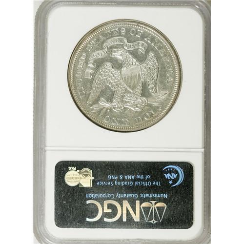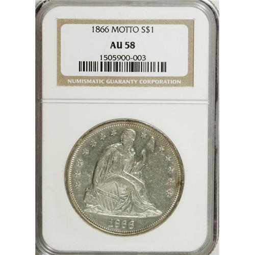 <B>1866 S$1 Motto AU58 NGC.</B></I> All four date digits are lightly repunched. Luster brightens all design elements, and the strike is bold throughout. A brilliant piece with faint friction and a few tiny ticks on the right obverse field. Only 48,900 pieces were struck for this initial Motto date. Census: 5 in 58, 33 finer (3/07).<BR><BR><b>Shipping:</b> Coins & Currency (<a target="_blank" href="http://www.heritageauctions.com/common/shipping.php">view shipping information</a>)