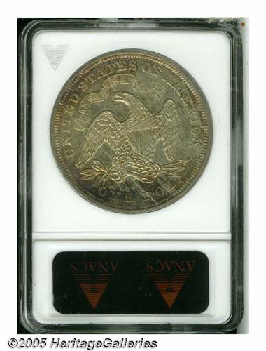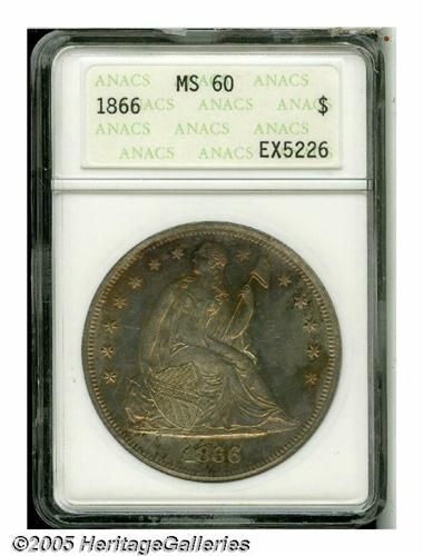 <B>1866<S$1> Motto MS60 ANACS.</B></I> Splashes of reddish-gold toning roll over each side. The design elements are sharply struck, and the surfaces display reasonable luster. Wispy hairlines are noted in the obverse fields.<BR><I>From The Dr. John L. Pellegrini Collection of Liberty Seated Dollars.</B></I>