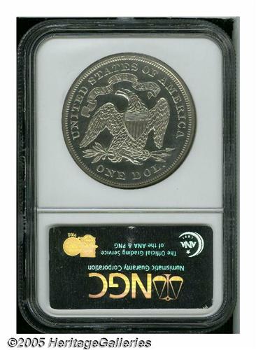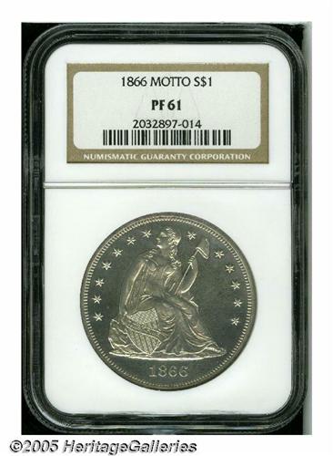 <B>1866<S$1> Motto PR61 NGC.</B></I> Fully struck and essentially contact-free, with untoned surfaces that reveal mild reflectivity and numerous faint hairlines in the fields, on both obverse and reverse. Just 725 proofs of this first-year With Motto issue were struck.