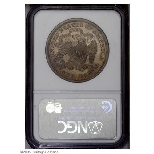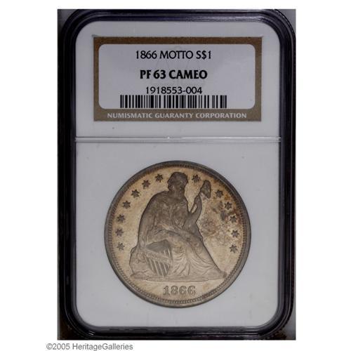 <B>1866<S$1> Motto PR63 Cameo NGC.</B></I> A splendid Proof example with pale heather and gold toning over deeply mirrored fields. The devices have exceptional mint frost with full cameo contrast, partially hidden by the toning. Not only is this an important offering for specialists in the Seated Dollar series, but it is also a highly desirable type coin for those seeking first-year of issue coinage. Population: 6 in 63, 23 finer (10/05).