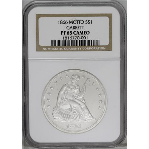 <B>1866<img border='0' src='http://www.heritagecoins.com/images/star.gif' width=10 height=10>$1> Motto PR65 Cameo NGC.</B></I> Ex: Garrett Collection. A significant degree of contrast is visible over each side of this snow-white gem. The premier proof issue of the new With Motto Seated Dollar type, the 1866 was produced to the extent of 725 pieces, all of which were distributed with the year's silver proof sets. While survivors are not particularly rare in an absolute sense, they are subjected to quite a bit of pressure from date collectors due to the scarcity of the business strike 1866. Of course, Gem specimens represent a very small percentage, perhaps as little a five percent, of the original production, and a coin with an early strike Cameo appearance is a step higher. Census: 7 in 65, 3 finer (3/06). <BR><BR><B>Important notice:</B> Heritage usually auctions material at the rate of 200-250 lots per hour. On some occasions eBay Live bid software or the Internet may not be able to keep up with the pace of the auction. We recommend placing a realistic absentee bid now as insurance to avoid disappointment. Occasionally the auctioneer may eliminate or reject an eBay Live bid, and the auctioneer may also reopen a lot after the close of the eBay live bidding (usually because we missed an audience bid), and may reject your bid even if it shows you as the winning bidder. By bidding via eBay Live, you agree that Heritage may award the lot to another bidder at its sole discretion under the circumstances described above or any other reasonable circumstances. Since eBay bids are not shown to us until we open the lot on the floor, we treat those bids just like floor bids. In most cases the floor responds before the eBay bid is presented to us, due to Internet lag time, so for consistency we have made it a policy that floor bids are always considered first over tie eBay live bids. Also please note that all Heritage lots purchased through eBay Live carry a 20% Buyer's Premium. Please make sure you read the Terms and Conditions before you bid. This lot is being auctioned in conjunction with a live floor auction by Heritage Galleries & Auctioneers. All final auction and invoice information will be supplied by Heritage Galleries & Auctioneers, and all other information should be considered preliminary. Lot:2205 <BR><BR><B>Winning Notification and Billing:</B> After the FINAL session in this auction is complete, Heritage will send e-mail and snail mail invoices. This process normally takes several days. All final auction and invoice information will be supplied by Heritage Galleries & Auctioneers, and all other information should be considered preliminary. <BR><BR>This auction will be conducted on a live auction floor and over the Internet through eBay Live. If you choose to place an absentee bid, please take a moment to <font color='#0000ff'><u><a href='http://pages.ebay.com/liveauctions/help/before/laabsentee.html'>learn how eBay Live absentee bidding works</a></u></font><font color='#000000'>