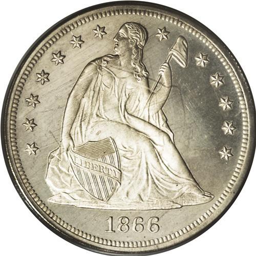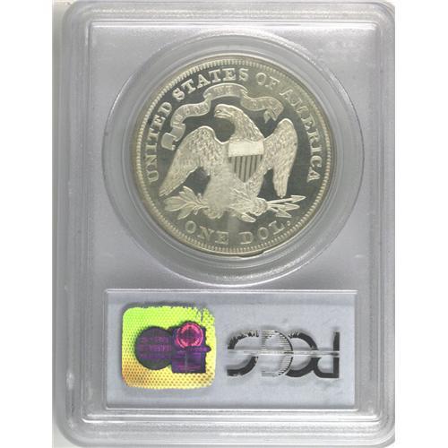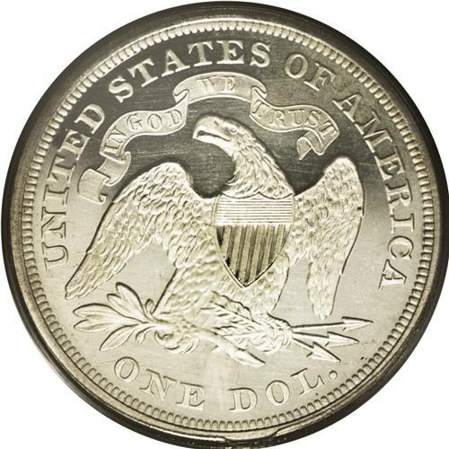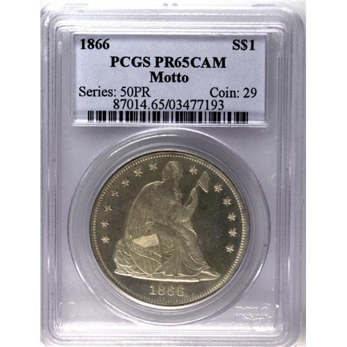 <B>1866<img border='0' src='http://www.heritagecoins.com/images/star.gif' width=10 height=10>$1> Motto PR65 Cameo PCGS.</B></I> Three different die marriages are known for the proof 1866 Motto Seated dollar. The present Gem is an example of the variety that Bowers (1993) describes as No. 3, and its diagnostics are:<BR><BR> 1. Date centered, 1 not repunched.<BR> 2. Reverse hub doubling on some of the letters in the motto IN GOD WE TRUST.<BR> 3. Reverse die scratch slanting up to the left from the top of the third leaf on the olive branch.<BR><BR> The motto IN GOD WE TRUST was first added to U.S. coinage by the terms of the Act of April 22, 1864, which also authorized the bronze cent and two cent piece. The subsequent Act of March 3, 1865 mandated that the quarter, half dollar, dollar, half eagle, eagle, and double eagle also display the new motto. The premier proof delivery of the new Motto Seated dollar type, the 1866 was produced to the extent of 725 pieces, all of which were distributed with the year's silver proof sets. While survivors are not particularly rare in an absolute sense, they are subjected to quite a bit of pressure from date collectors due to the scarcity of the business strike 1866. Of course, this coin displays surfaces that are so smooth that its unquestionable rarity is not tied to any factor other than the general lack of care with which proof Seated dollars were preserved.<BR> Each side presents a thin coating of hazy champagne patina that hardly diminishes the brilliant flash of the surfaces. Varying light angles also draw forth glassy reflectivity in the fields, which contrasts appreciably with the full, frosty finished devices. Population: 7 in 65 Cameo, 3 finer (7/06).