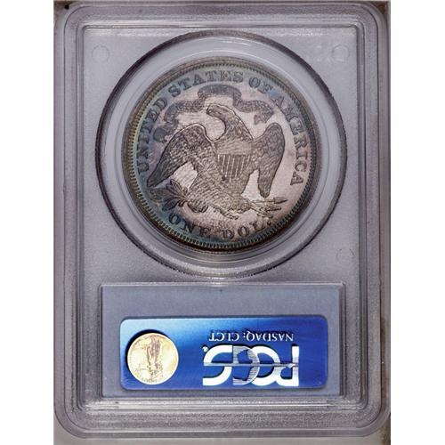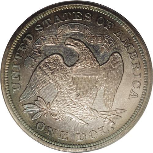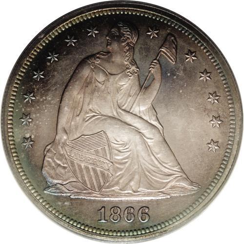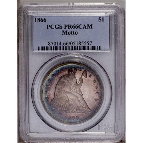 <B>1866<img border='0' src='http://www.heritagecoins.com/images/star.gif' width=10 height=10>$1> Motto PR66 Cameo PCGS.</B></I> The Mint struck 725 proof dollars With Motto in 1866, of which about 360 or so have been certified by PCGS and NGC. Of these, around 65 have been assigned the Cameo designation. The lovely Premium Gem Cameo presented here displays delicate iridescent cobalt-blue and lilac toning, which is mostly confined to the border areas. This transitions to lower intensity lilac and magenta coloration in the centers. The mildly frosted design elements are exquisitely defined, and are nicely highlighted against the reflective fields, further enhancing the coin's eye appeal. A few unobtrusive hairlines scattered about are mentioned for accuracy. A truly outstanding all-around specimen. Population: 2 in 66, 1 finer (3/06). <BR><BR><B>Important notice:</B> Heritage usually auctions material at the rate of 200-250 lots per hour. On some occasions eBay Live bid software or the Internet may not be able to keep up with the pace of the auction. We recommend placing a realistic absentee bid now as insurance to avoid disappointment. Occasionally the auctioneer may eliminate or reject an eBay Live bid, and the auctioneer may also reopen a lot after the close of the eBay live bidding (usually because we missed an audience bid), and may reject your bid even if it shows you as the winning bidder. By bidding via eBay Live, you agree that Heritage may award the lot to another bidder at its sole discretion under the circumstances described above or any other reasonable circumstances. Since eBay bids are not shown to us until we open the lot on the floor, we treat those bids just like floor bids. In most cases the floor responds before the eBay bid is presented to us, due to Internet lag time, so for consistency we have made it a policy that floor bids are always considered first over tie eBay live bids. Also please note that all Heritage lots purchased through eBay Live carry a 20% Buyer's Premium. Please make sure you read the Terms and Conditions before you bid. This lot is being auctioned in conjunction with a live floor auction by Heritage Galleries & Auctioneers. All final auction and invoice information will be supplied by Heritage Galleries & Auctioneers, and all other information should be considered preliminary. Lot:2206 <BR><BR><B>Winning Notification and Billing:</B> After the FINAL session in this auction is complete, Heritage will send e-mail and snail mail invoices. This process normally takes several days. All final auction and invoice information will be supplied by Heritage Galleries & Auctioneers, and all other information should be considered preliminary. <BR><BR>This auction will be conducted on a live auction floor and over the Internet through eBay Live. If you choose to place an absentee bid, please take a moment to <font color='#0000ff'><u><a href='http://pages.ebay.com/liveauctions/help/before/laabsentee.html'>learn how eBay Live absentee bidding works</a></u></font><font color='#000000'>