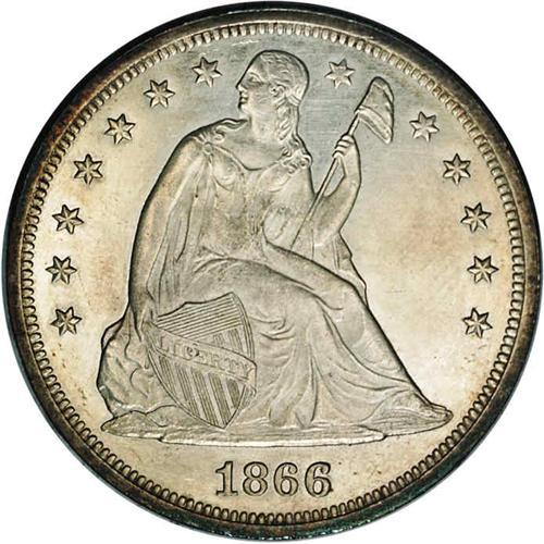 <B>1866<S$1> Motto--Improperly Cleaned--NCS. Unc Details.</B></I> The introductory Motto issue is scarce but not rare by the difficult standards of Seated Dollars. This well struck example is moderately prooflike and has light chestnut toning on the obverse. The reverse is nearly untoned. Rotation beneath a light and a loupe reveals a few faint hairlines in the fields, but these are not distracting. The 1 in the date is nicely repunched, the 8 and second 6 show minor recutting, and the reverse is die tripled, most noticeable on TRUST.