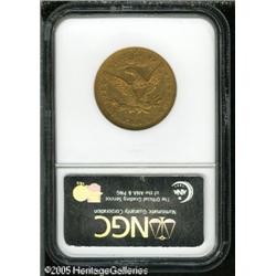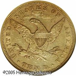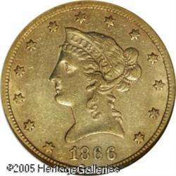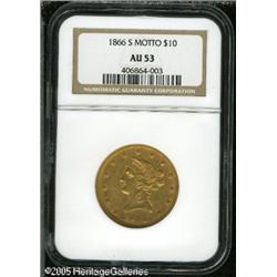 <B>1866-S $10 Motto AU53 NGC.</B></I> Because of the time and distance between the Philadelphia Mint and the one in San Francisco, the modified dies with the new motto did not reach the west coast until April 1866. As a result, almost half of the mintage of ten dollar gold pieces did not show the new motto. This is one of the finer examples known of the 11,500 struck with IN GOD WE TRUST on the reverse. Significant original mint luster remains and each side is covered with rich reddish patina. A bit softly struck, the surfaces show numerous small abrasions but none that are of singular importance. Population: 6 in 53, 6 finer (1/05). Lot:8762