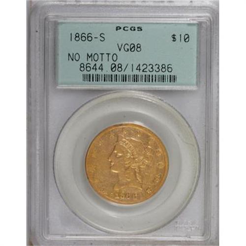 <B>1866-S $10 No Motto VG8 PCGS.</B></I> Though heavily circulated, this S-mint piece retains its essential character and even a measure of luster in the fields. This final No Motto eagle issue amounted to just 8,500 examples. Population: 1 in 8, 26 finer (8/07).<BR><BR><B>Coin Engraver:</B> Christian Gobrecht<BR><BR><b>Shipping:</b> Coins & Currency (<a target="_blank" href="http://www.heritageauctions.com/common/shipping.php">view shipping information</a>)