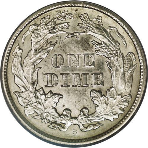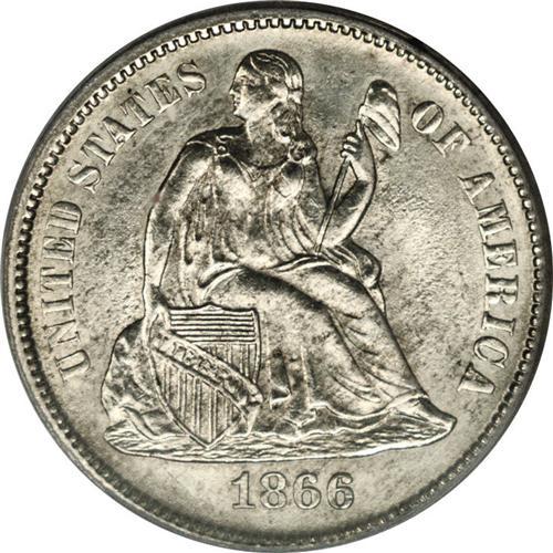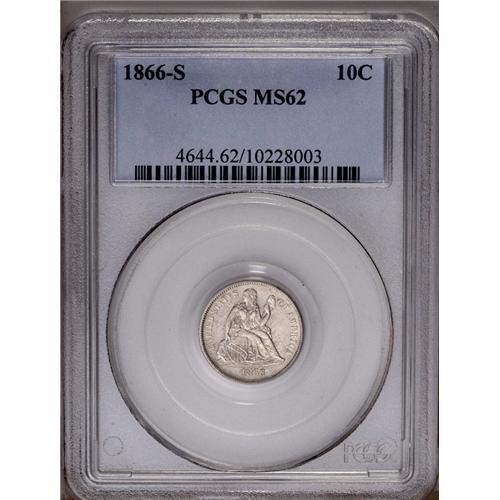 <B>1866-S<10C> MS62 PCGS.</B></I> Fortin-101. The mintmark is bold, unlike the Fortin plate coin. The 1866-S is a better date in all grades, and is seldom encountered above VF. In Mint State, it is a noteworthy rarity. PCGS has only certified six pieces across all Uncirculated grades. This sharply struck representative is close to brilliant, and is surprisingly unblemished for the MS62 level. Satin luster is subdued but unbroken. Population: 2 in 62, 3 finer (4/06).