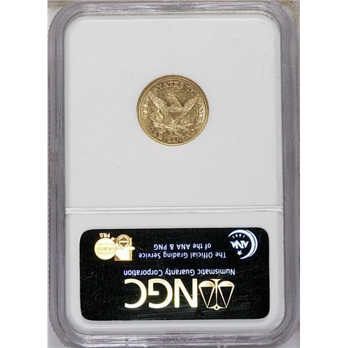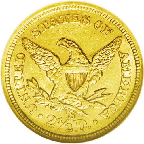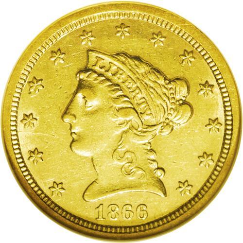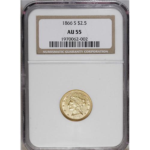 <B>1866-S<$2 1/2> AU55 NGC.</B></I> This issue is surprisingly difficult to acquire in grades above XF. The present example has just a trace of highpoint wear, and the straw-gold surfaces retain almost all of their original luster. The reverse displays the usual weakness on the eagle's left (facing) leg and an abrasion appears in the left obverse field, but this piece has high eye appeal.