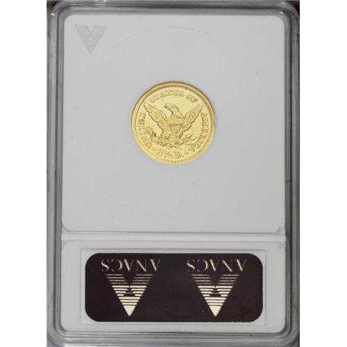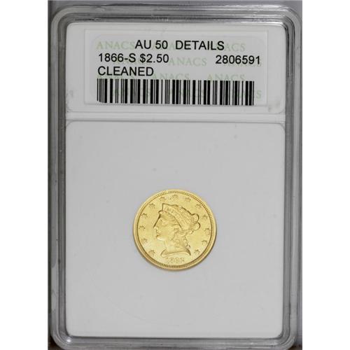 <B>1866-S<$2 1/2>--Cleaned--ANACS. AU50 Details.</B></I> The yellow-orange surfaces have unnatural luster. The lightly worn devices are nicely detailed, but a scrape appears to the right of the date.