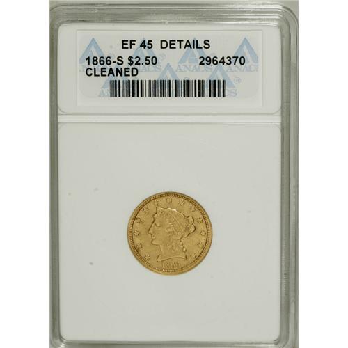 <B>1866-S $2 1/2 --Cleaned--ANACS. XF45 Details .</B></I> NGC Census: (40/80). PCGS Population (20/30). Mintage: 38,900. Numismedia Wsl. Price: $820. (#7804)<BR><BR><b>Shipping:</b> Coins & Currency (<a target="_blank" href="http://www.heritageauctions.com/common/shipping.php">view shipping information</a>)