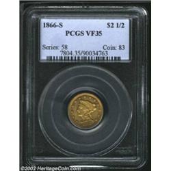 1866-S $2 1/2 VF35 PCGS. Somewhat softly struck in the centers, while the borders have rich detail..