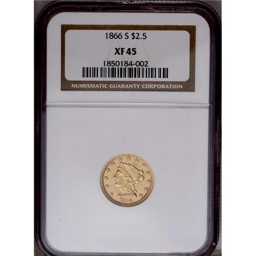 1866-S $2 1/2 XF45 NGC. Semi-bright brassy-gold surfac 1866-S[$2 1/2] XF45 NGC.