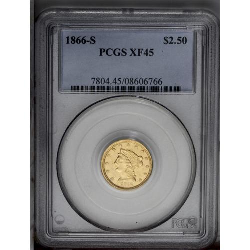 <B>1866-S<$2 1/2> XF45 PCGS.</B></I> A moderately scarce issue that is usually not available any finer than XF. This piece shows the usually seen striking softness common to S-mint quarter eagles of this period. Light greenish-gold in color, and traces of pale luster adhere to protected areas. Scarcer than the mintage of 38,960 pieces would indicate. <BR><BR><B>Important notice:</B> Heritage usually auctions material at the rate of 200-250 lots per hour. On some occasions eBay Live bid software or the Internet may not be able to keep up with the pace of the auction. We recommend placing a realistic absentee bid now as insurance to avoid disappointment. Occasionally the auctioneer may eliminate or reject an eBay Live bid, and the auctioneer may also reopen a lot after the close of the eBay live bidding (usually because we missed an audience bid), and may reject your bid even if it shows you as the winning bidder. By bidding via eBay Live, you agree that Heritage may award the lot to another bidder at its sole discretion under the circumstances described above or any other reasonable circumstances. Since eBay bids are not shown to us until we open the lot on the floor, we treat those bids just like floor bids. In most cases the floor responds before the eBay bid is presented to us, due to Internet lag time, so for consistency we have made it a policy that floor bids are always considered first over tie eBay live bids. Also please note that all Heritage lots purchased through eBay Live carry a 20% Buyer's Premium. Please make sure you read the Terms and Conditions before you bid. This lot is being auctioned in conjunction with a live floor auction by Heritage Galleries & Auctioneers. All final auction and invoice information will be supplied by Heritage Galleries & Auctioneers, and all other information should be considered preliminary. Lot:2415 <BR><BR><B>Winning Notification and Billing:</B> After the FINAL session in this auction is complete, Heritage will send e-mail and snail mail invoices. This process normally takes several days. All final auction and invoice information will be supplied by Heritage Galleries & Auctioneers, and all other information should be considered preliminary. <BR><BR>This auction will be conducted on a live auction floor and over the Internet through eBay Live. If you choose to place an absentee bid, please take a moment to <font color='#0000ff'><u><a href='http://pages.ebay.com/liveauctions/help/before/laabsentee.html'>learn how eBay Live absentee bidding works</a></u></font><font color='#000000'>