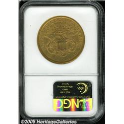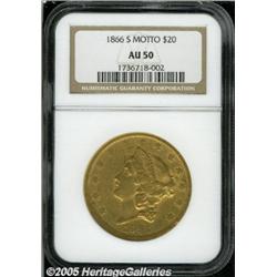 <B>1866-S $20 Motto AU50 NGC.</B></I> Softly struck on portions of Liberty's hair and in the star centers, with straw-gold patina and traces of luster in some of the protected areas. Some small abrasions are noted over each side. A very scarce issue that is an important condition rarity as well, with the average coin only grading a mid-range VF.
