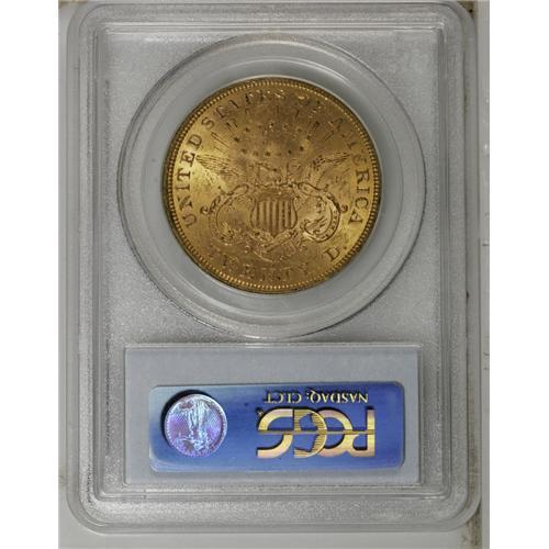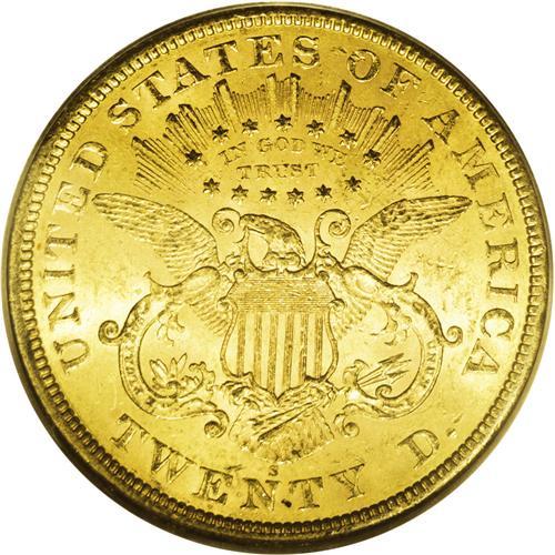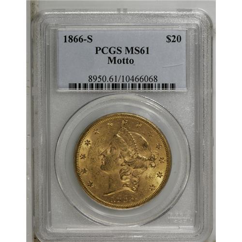 <B>1866-S<$20> Motto MS61 PCGS.</B></I> To quote from the Garrett-Guth gold <I>Encyclopedia</B></I> concerning this issue, "Very few coins of the date have turned up in Mint State over the last 140 years. There are probably only about two dozen examples known that qualify as Uncirculated. None are known in choice condition." While this piece has considerable abrasions on each side, the luster is good underneath the smoky gray-gold surfaces, with some darker areas on the highpoints of each side. Most of the obverse stars are well brought up. The right serif is missing at the bottom of the N in the motto. Population: 13 in 61, 6 finer (9/06).