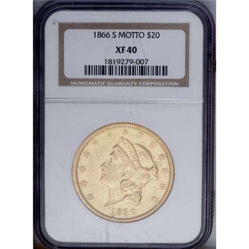 <B>1866-S $20 Motto XF40 NGC.</B></I> Evidence of friction is confined to the highpoints and no marks are singularly distracting. An affordable example of this first year Type Two example.