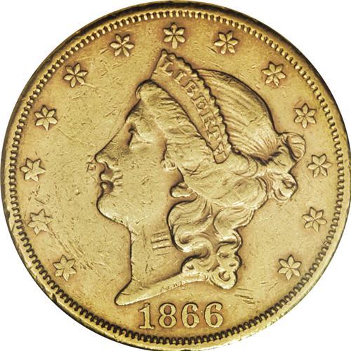 <B>1866-S $20 No Motto AU50 NGC.</B></I> The last of the Type One double eagle issues, the 1866-S No Motto was struck early in the year prior to the arrival from Philadelphia of the new reverse dies featuring IN GOD WE TRUST within the cluster of stars above the eagle. The exact mintage of this formidable scarcity is unknown, with estimates ranging from 12,000 pieces (the current <I>Guide Book</B></I> estimate) to an unrealistically high figure of 120,000 coins. Representatives in AU and finer grades are among the elite survivors. This example, while liberally abraded, retains a generous amount of luster and pleasing reddish accents. Census: 18 in 50, 36 finer (11/06).<BR><BR><b>Shipping:</b> Coin/Currency (<a target="_blank" href="http://www.heritageauctions.com/common/shipping.php">view shipping information</a>)