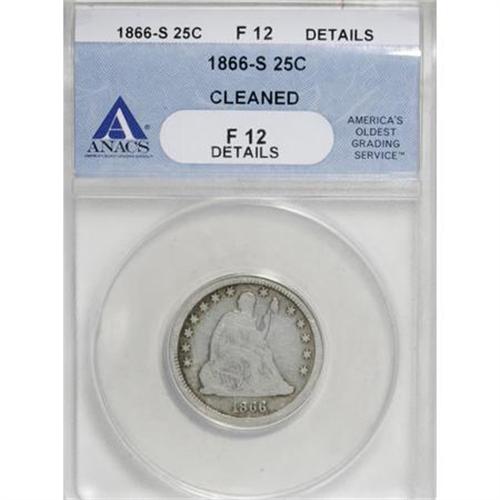<B>1866-S 25C --Cleaned--ANACS. F12 Details.</B></I> NGC Census: (2/13). PCGS Population (3/26). Mintage: 28,000. Numismedia Wsl. Price for NGC/PCGS coin in F12: $450. (#5469)<BR><BR><B>Coin Engraver:</B> Christian Gobrecht<BR><BR><b>Shipping:</b> Coins & Currency (<a target="_blank" href="http://www.heritageauctions.com/common/shipping.php">view shipping information</a>)