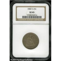 1866-S 25C XF45 NGC. Wholly original rose-gray sur <B>1866-S 25C XF45 NGC.</B></I> Wholly original rose-gray surfaces are evenly patinated over each side. Just 28,000 examples of this first year With Motto issue were produced, and the survival rate in all grades is extremely low. <BR><BR><B>Important notice:</B> Heritage usually auctions material at the rate of 200-250 lots per hour. On some occasions eBay Live bid software or the Internet may not be able to keep up with the pace of the auction. We recommend placing a realistic absentee bid now as insurance to avoid disappointment. Occasionally the auctioneer may eliminate or reject an eBay Live bid, and the auctioneer may also reopen a lot after the close of the eBay live bidding (usually because we missed an audience bid), and may reject your bid even if it shows you as the winning bidder. By bidding via eBay Live, you agree that Heritage may award the lot to another bidder at its sole discretion under the circumstances described above or any other reasonable circumstances. Since eBay bids are not shown to us until we open the lot on the floor, we treat those bids just like floor bids. In most cases the floor responds before the eBay bid is presented to us, due to Internet lag time, so for consistency we have made it a policy that floor bids are always considered first over tie eBay live bids. Also please note that all Heritage lots purchased through eBay Live carry a 20% Buyer's Premium. Please make sure you read the Terms and Conditions before you bid. This lot is being auctioned in conjunction with a live floor auction by Heritage Galleries & Auctioneers. All final auction and invoice information will be supplied by Heritage Galleries & Auctioneers, and all other information should be considered preliminary. Lot:5887