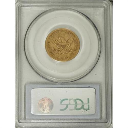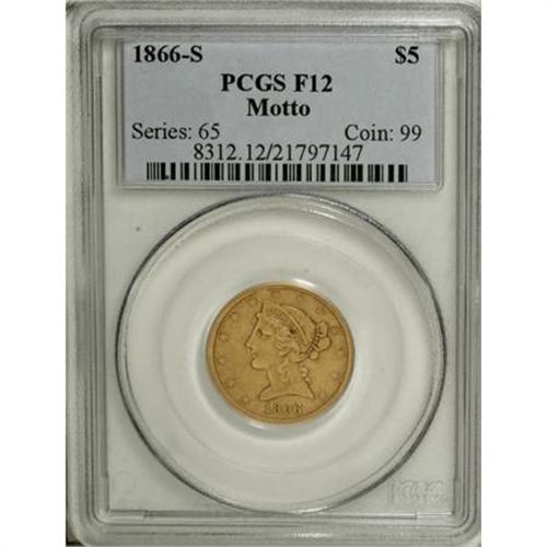 <B>1866-S $5 Motto Fine 12 PCGS.</B></I> A heavily circulated, yet fundamentally pleasing example of this later 1866-S half eagle variant. Deep orange-gold surfaces show occasional mustard accents and light abrasions. Population: 4 in 12, 41 finer (2/08).<BR><BR><B>Coin Engraver:</B> Christian Gobrecht<BR><BR><b>Shipping:</b> Coins & Currency (<a target="_blank" href="http://www.heritageauctions.com/common/shipping.php">view shipping information</a>)