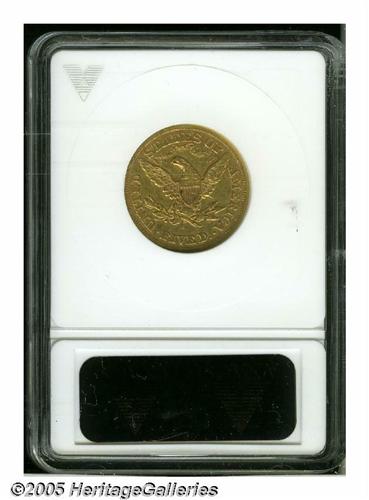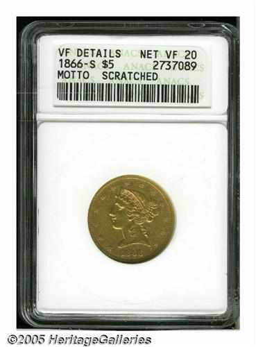 <B>1866-S<$5> Motto--Scratched--ANACS. VF Details, Net VF20.</B></I> A horizontal scratch reaches the upper arrowhead. Otherwise, this pale gold example is relatively unabraded and has bold plumage definition. Less than 35,000 pieces were struck for this rare introductory S-mint Motto issue.