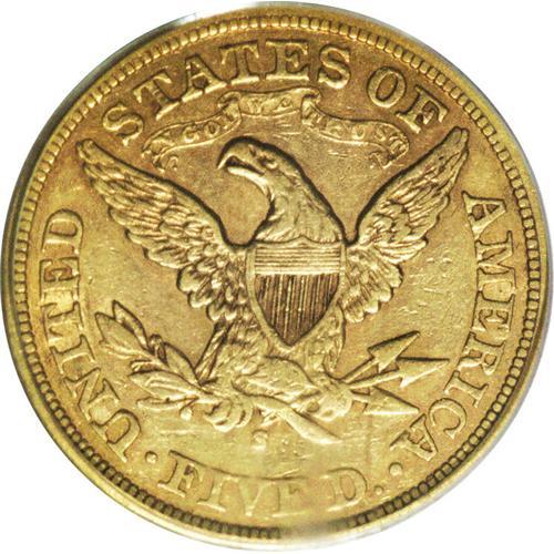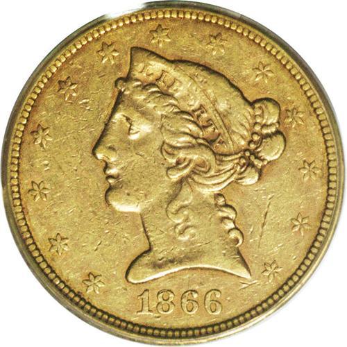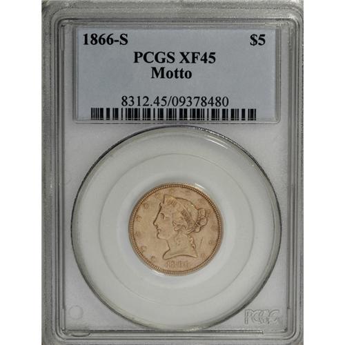 <B>1866-S $5 Motto XF45 PCGS.</B></I> First year of the With Motto design, and an especially scarce issue in any grade above VF. This piece is typically struck with reddish-gray color and a few noticeable marks on either side. The highpoints of the design show a normal degree of wear for the grade.<BR><BR><b>Shipping:</b> Coins & Currency (<a target="_blank" href="http://www.heritageauctions.com/common/shipping.php">view shipping information</a>)