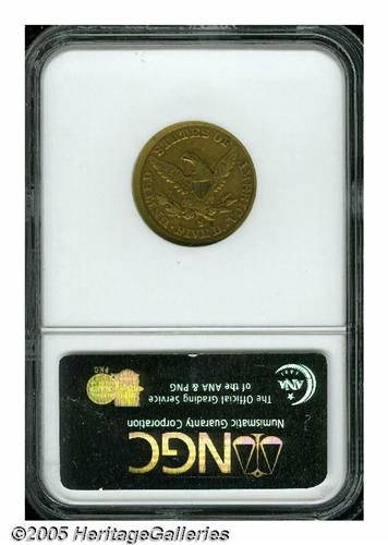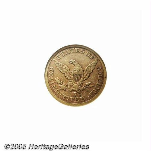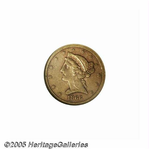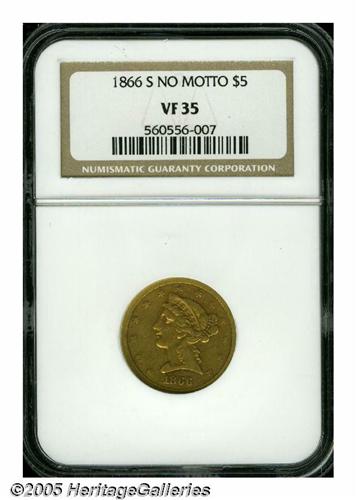 <B>1866-S<$5> No Motto VF35 NGC.</B></I> Both sides of this attractive, well balanced example are tinged in coppery-orange patina. A reeding mark on Liberty's neck just below her lowest curl is useful for attribution. Just 9,000 Half Eagles were produced in this transitional year without IN GOD WE TRUST above the eagle. Most, like this piece, are rather heavily circulated. Population: 13 in 35, 19 finer (6/05).