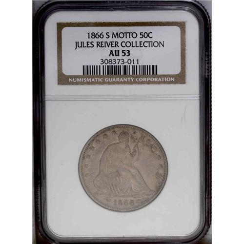 1866-S 50C Motto AU53 NGC. First year of issue for the 1866-S[50C] Motto AU53 NGC.