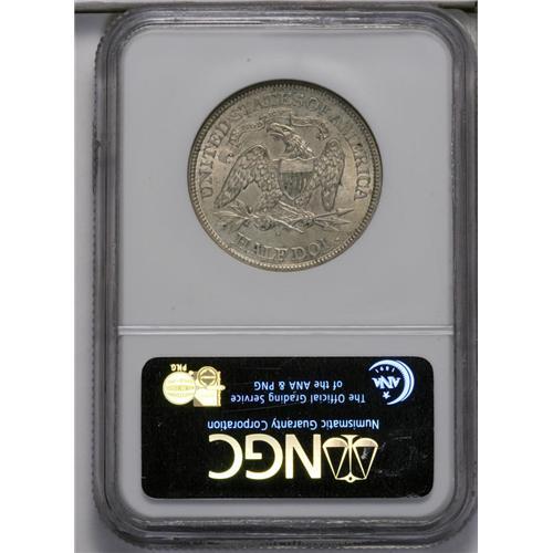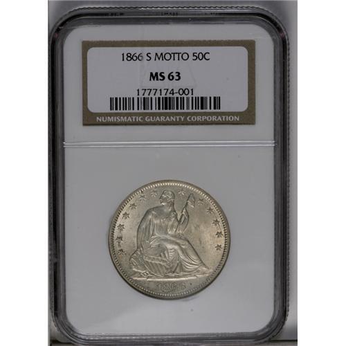 <B>1866-S<50C> Motto MS63 NGC.</B></I> Light beige and pale apricot patina bathes lustrous surfaces that are virtually unabraded. The design features are well struck up, further enhancing the eye appeal of this attractive specimen. Wispy die clash marks and die cracks are noted on both obverse and reverse. Census: 2 in 63, 13 finer (5/06).