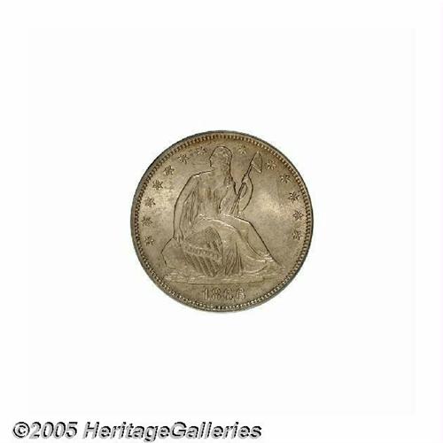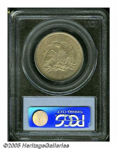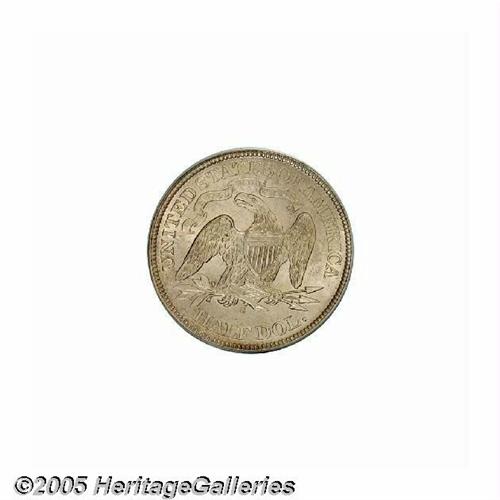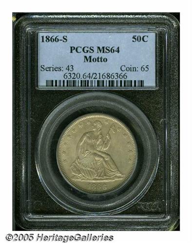 <B>1866-S<50C> Motto MS64 PCGS.</B></I> Almost a million S-mint Halves were produced in 1866, even though the dies did not reach the west coast until May of that year. The need for small denomination was still strong, as it had been since the late 1840s, and most of the mintage was heavily circulated with very few examples known today in Mint State. Only five other pieces have been so graded by PCGS with two finer (6/05). This is a sharply struck example that is satiny with mostly even gold toning over the obverse and reverse. An important Half Dollar for the specialist.<BR>It would appear that the new reverse motto, which was first used in 1866, was hand engraved. Note the repunching on the first T of TRUST, and the extra lower right serif from the R well below the ribbon, and a couple of small lumps around the right ribbon folds on the end.