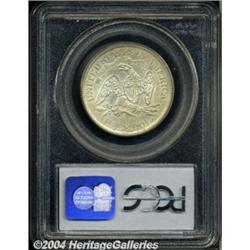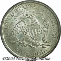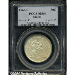 <B>1866-S<50C> Motto MS64 PCGS.</B></I> A well struck and satiny near-Gem with creamy pearl-gray and apricot patina. The satiny surfaces are virtually undisturbed, although thorough inspection reveals a pair of short and wispy pinscratches in the right obverse field, made inconspicuous by the rich original toning. A "partial drapery" variety with faint clashmarks on both sides near the central devices. PCGS has only certified 16 pieces in all Mint State grades. Population: 6 in 64, 3 finer (6/04). <BR><BR><B>Important notice:</B> Heritage usually auctions material at the rate of 200-250 lots per hour. On some occasions eBay Live bid software or the Internet may not be able to keep up with the pace of the auction. We recommend placing a realistic absentee bid now as insurance to avoid disappointment. Occasionally the auctioneer may eliminate or reject an eBay Live bid, and the auctioneer may also reopen a lot after the close of the eBay live bidding (usually because we missed an audience bid), and may reject your bid even if it shows you as the winning bidder. By bidding via eBay Live, you agree that Heritage may award the lot to another bidder at its sole discretion under the circumstances described above or any other reasonable circumstances. Since eBay bids are not shown to us until we open the lot on the floor, we treat those bids just like floor bids. In most cases the floor responds before the eBay bid is presented to us, due to Internet lag time, so for consistency we have made it a policy that floor bids are always considered first over tie eBay live bids. Also please note that all Heritage lots purchased through eBay Live carry a 20% Buyer's Premium. Please make sure you read the Terms and Conditions before you bid. </span></font></tr></table></td></tr></table>