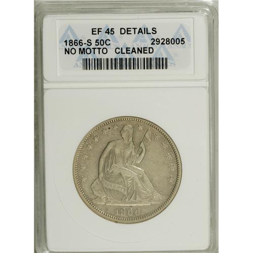 <B>1866-S 50C No Motto--Cleaned--ANACS. XF45 Details.</B></I> Gently shimmering luster emerges from the crevices of this subdued but richly detailed pearl-gray example. A hint of granularity is noted above the arrow heads. Only 60,000 pieces were struck.<BR><I>From The Edward Sacks Collection.</B></I><BR><BR><b>Shipping:</b> Coins & Currency (<a target="_blank" href="http://www.heritageauctions.com/common/shipping.php">view shipping information</a>)