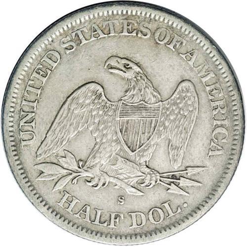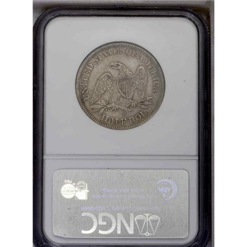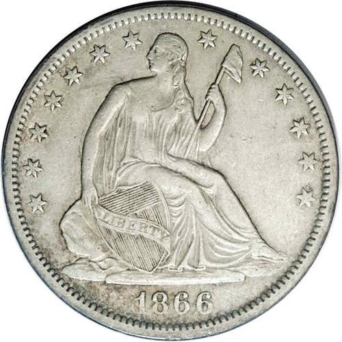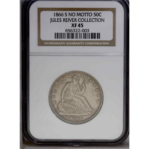<B>1866-S<50C> No Motto XF45 NGC.</B></I> Tan-brown luster accompanies steel-gray fields and highpoints. A richly detailed and relatively unmarked example. Only 60,000 No Motto 1866-S Halves were struck, apparently coined early in the year prior to the arrival of Motto dies made at the Philadelphia Mint. The No Motto variety is scarce in all grades, and the Wiley-Bugert standard reference estimates XF/AU pieces as Rarity 5.