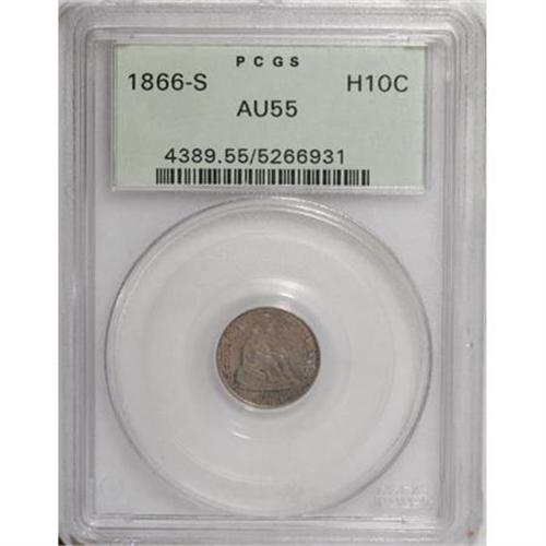 <B>1866-S H10C AU55 PCGS.</B></I> V-1, Blundered Date. PCGS Population (7/37). NGC Census: (3/53). Mintage: 120,000. Numismedia Wsl. Price for NGC/PCGS coin in AU55: $317. (#4389)<BR><BR><B>Coin Engraver:</B> Christian Gobrecht<BR><BR><b>Shipping:</b> Coins & Currency (<a target="_blank" href="http://www.heritageauctions.com/common/shipping.php">view shipping information</a>)