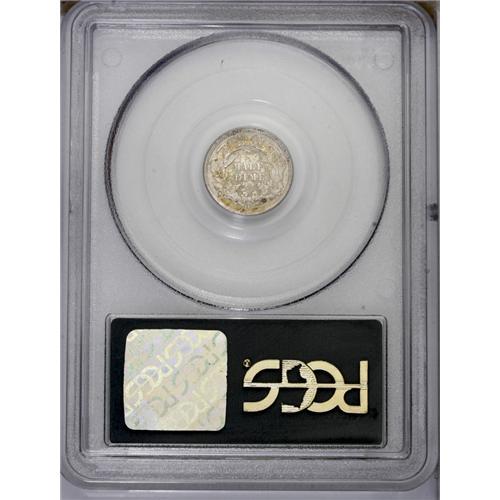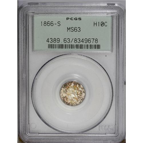 <B>1866-S<H10C> MS63 PCGS.</B></I> Gold, fire-red, and apple-green splashes endow both sides of this nicely struck and satiny better date half dime. Affordable despite its scarcity, and housed in a prior generation holder. Population: 11 in 63, 14 finer (3/06). <BR><BR><B>Important notice:</B> Heritage usually auctions material at the rate of 200-250 lots per hour. On some occasions eBay Live bid software or the Internet may not be able to keep up with the pace of the auction. We recommend placing a realistic absentee bid now as insurance to avoid disappointment. Occasionally the auctioneer may eliminate or reject an eBay Live bid, and the auctioneer may also reopen a lot after the close of the eBay live bidding (usually because we missed an audience bid), and may reject your bid even if it shows you as the winning bidder. By bidding via eBay Live, you agree that Heritage may award the lot to another bidder at its sole discretion under the circumstances described above or any other reasonable circumstances. Since eBay bids are not shown to us until we open the lot on the floor, we treat those bids just like floor bids. In most cases the floor responds before the eBay bid is presented to us, due to Internet lag time, so for consistency we have made it a policy that floor bids are always considered first over tie eBay live bids. Also please note that all Heritage lots purchased through eBay Live carry a 20% Buyer's Premium. Please make sure you read the Terms and Conditions before you bid. This lot is being auctioned in conjunction with a live floor auction by Heritage Galleries & Auctioneers. All final auction and invoice information will be supplied by Heritage Galleries & Auctioneers, and all other information should be considered preliminary. Lot:1905 <BR><BR><B>Winning Notification and Billing:</B> After the FINAL session in this auction is complete, Heritage will send e-mail and snail mail invoices. This process normally takes several days. All final auction and invoice information will be supplied by Heritage Galleries & Auctioneers, and all other information should be considered preliminary. <BR><BR>This auction will be conducted on a live auction floor and over the Internet through eBay Live. If you choose to place an absentee bid, please take a moment to <font color='#0000ff'><u><a href='http://pages.ebay.com/liveauctions/help/before/laabsentee.html'>learn how eBay Live absentee bidding works</a></u></font><font color='#000000'>