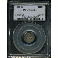 1866-S H10C MS64 PCGS. Lilac and sea-green colors <B>1866-S H10C MS64 PCGS.</B></I> Lilac and sea-green colors intermingle throughout this lustrous and sharply struck Choice Half Dime. There are no noticeable handling marks. Only 120,000 pieces were struck, and nearly all of these went into circulation. Population: 8 in 64, 6 finer (10/04). <BR><BR><B>Important notice:</B> Heritage usually auctions material at the rate of 200-250 lots per hour. On some occasions eBay Live bid software or the Internet may not be able to keep up with the pace of the auction. We recommend placing a realistic absentee bid now as insurance to avoid disappointment. Occasionally the auctioneer may eliminate or reject an eBay Live bid, and the auctioneer may also reopen a lot after the close of the eBay live bidding (usually because we missed an audience bid), and may reject your bid even if it shows you as the winning bidder. By bidding via eBay Live, you agree that Heritage may award the lot to another bidder at its sole discretion under the circumstances described above or any other reasonable circumstances. Since eBay bids are not shown to us until we open the lot on the floor, we treat those bids just like floor bids. In most cases the floor responds before the eBay bid is presented to us, due to Internet lag time, so for consistency we have made it a policy that floor bids are always considered first over tie eBay live bids. Also please note that all Heritage lots purchased through eBay Live carry a 20% Buyer's Premium. Please make sure you read the Terms and Conditions before you bid. This lot is being auctioned in conjunction with a live floor auction by Heritage Galleries & Auctioneers. All final auction and invoice information will be supplied by Heritage Galleries & Auctioneers, and all other information should be considered preliminary. Lot:5689