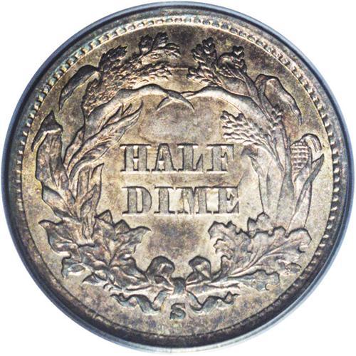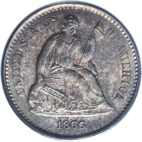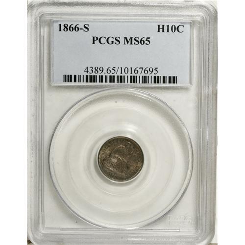 <B>1866-S H10C MS65 PCGS.</B></I> A full complement of frosty luster is visible beneath deep gray, lilac, and gold toning with a lighter appearance on the reverse. This is a splendid Gem with nearly full design details on each side. Only 120,000 of these pieces were coined and nearly all entered circulation, thus the typical survivor is in low-grade. The existence of high-quality pieces is due mostly to the luck of survival, although a small number of pieces were included in a New York hoard that was discovered nearly 40 years ago. Population: 5 in 65, 3 finer (10/06).<BR><BR><b>Shipping:</b> Coin/Currency (<a target="_blank" href="http://www.heritageauctions.com/common/shipping.php">view shipping information</a>)