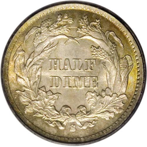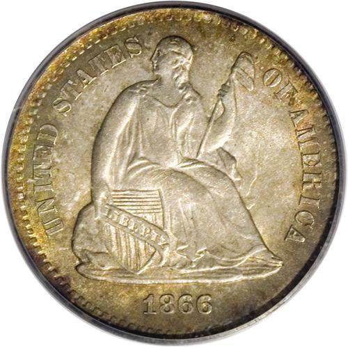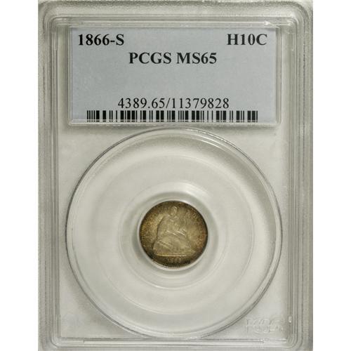 1866-S H10C MS65 PCGS. The 1866-S half dime, with its