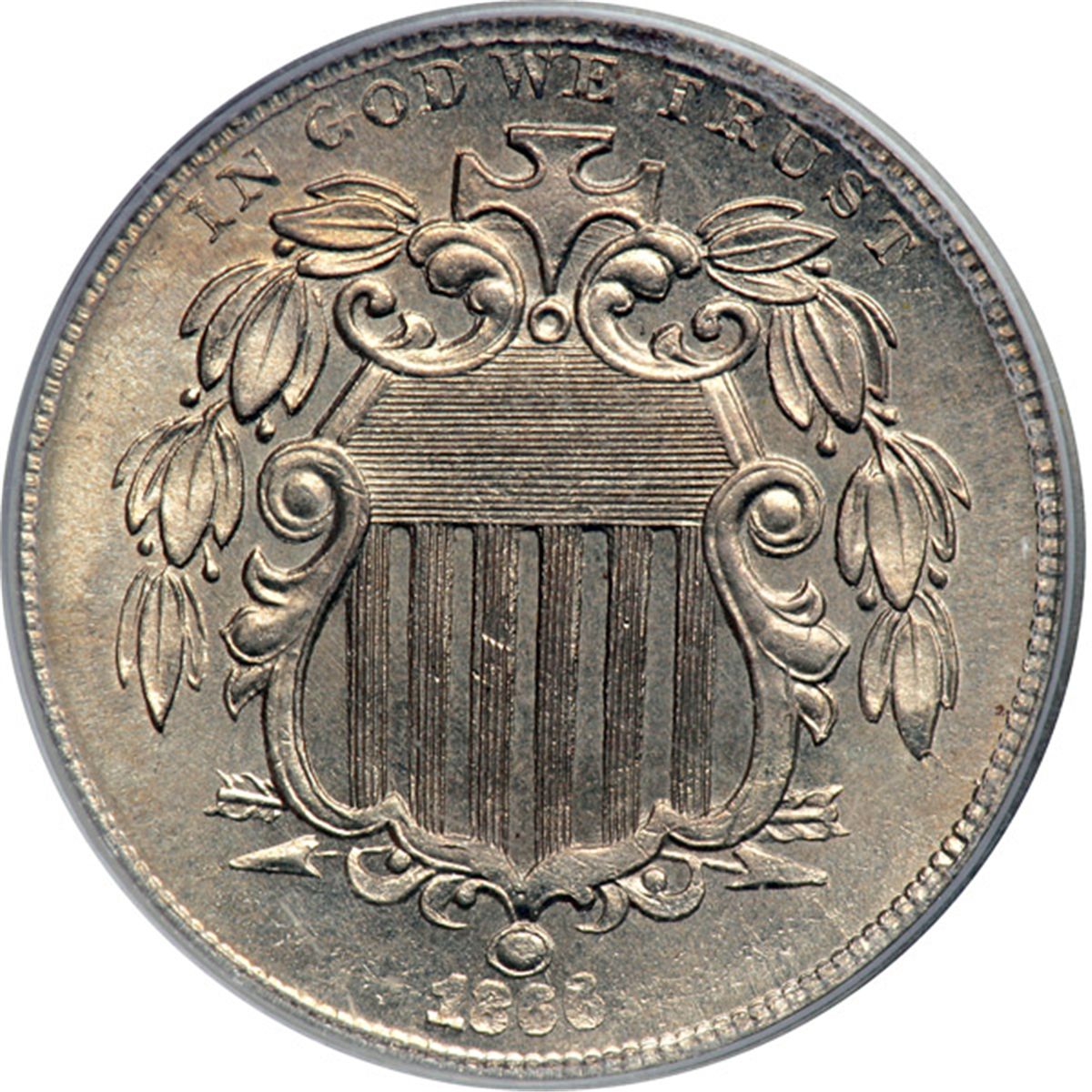 1866 Shield Nickel. PCGS graded MS-65. A fully lustrous gem example, untoned. As often happens on first-year issues, the Mint experienced some striking difficulties with the Shield Nickel. The rays element on the reverse caused excessive die wear and breakage. Though making the coin distinctive and highly attractive for this modest design, the Mint chose to remove the rays from later issue, thus improving die-life and lessening the possibility of die breaks forming. Always in strong demand as a two-year Type as well as for its First Year status. A classy looking specimen in this Gem condition.