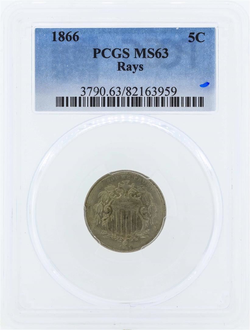 One 1866 Shield Nickel Coin with Rays PCGS MS63. PCGS Certified.