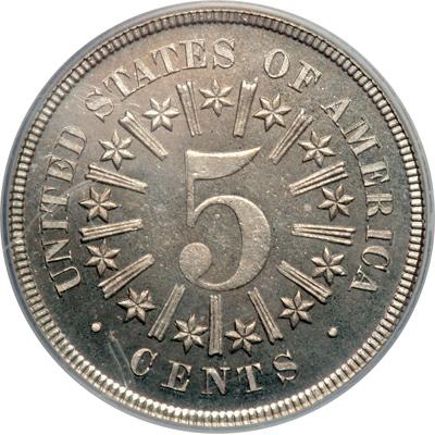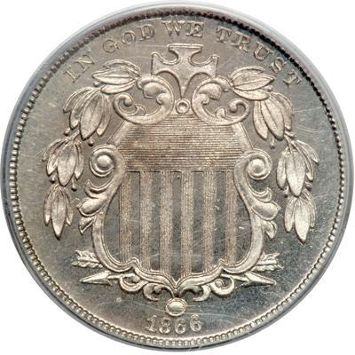 1866 Shield Nickel With Rays. PCGS graded Proof 65 Cameo. Appealing steel grey color with subtle underlying golden hues. A showy Gem Proof of the first year Shield Nickel with a cocktail of underlying reflective surface, frosty to satiny on the devices, and originality that breathes scorching life into the entire composition. Need we say more? Why yes! -- a number of other things, including the fact the devices are struck razor-sharp with crisp details aplenty. Only 600 + Proofs struck. Pop 24; 32 finer, 29 in 66, 3 in 67 (PCGS # 83817) .