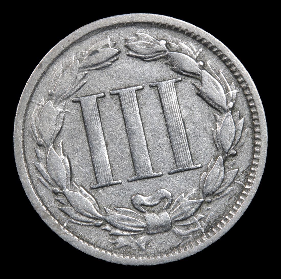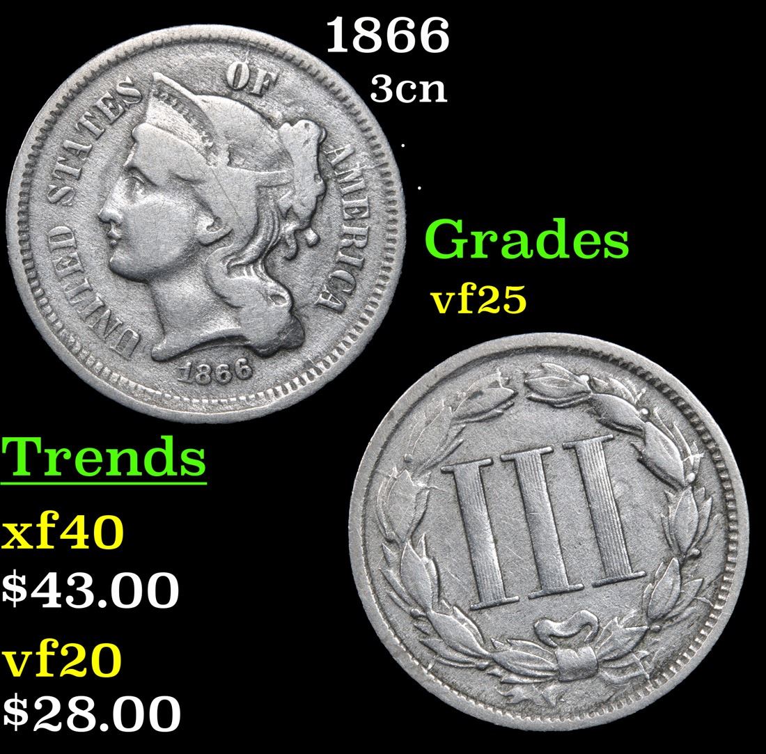 1866 . . Three Cent Copper Nickel 3cn Grades vf+.