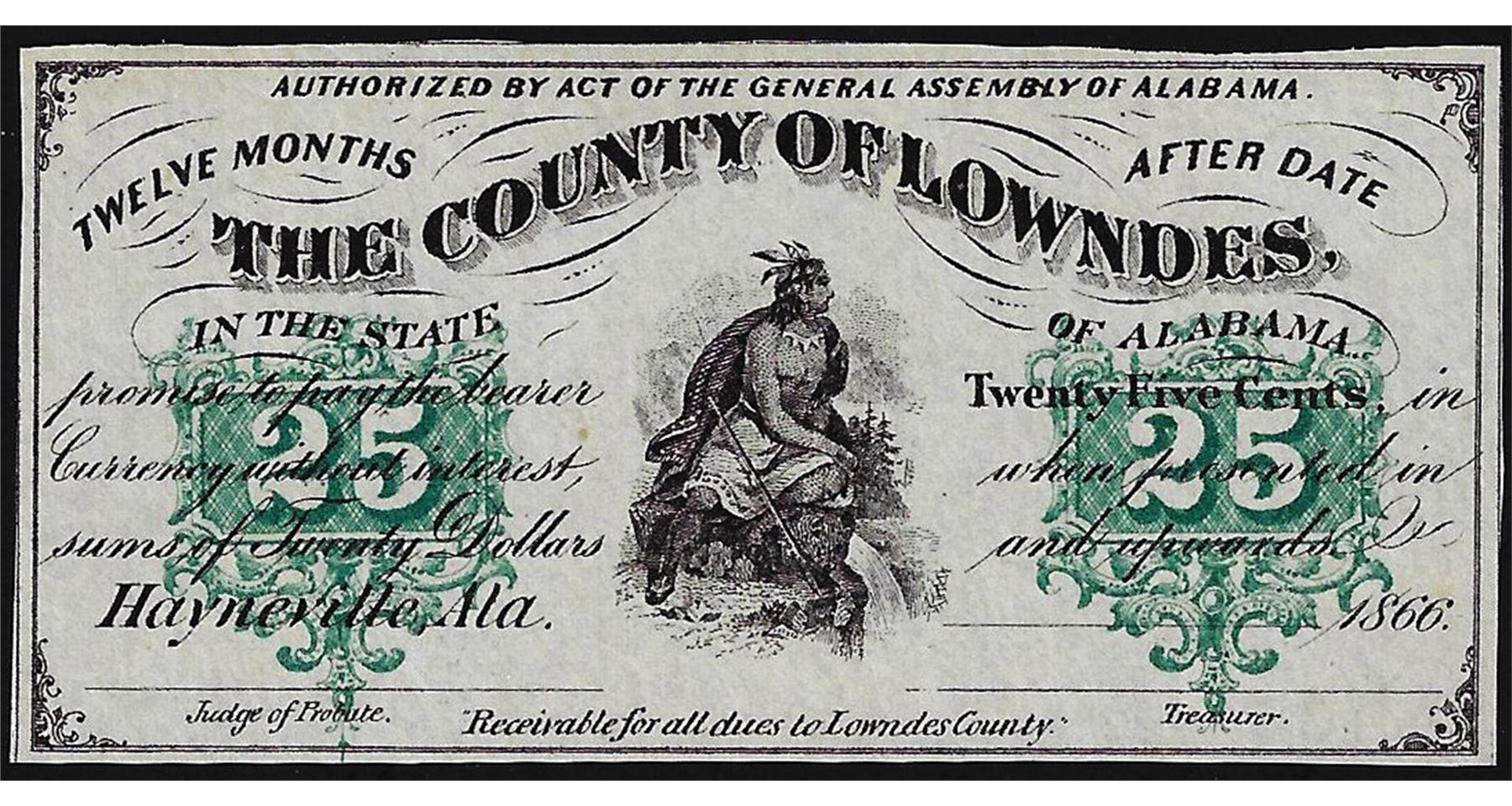 One 1866 Twenty-Five Cents County of Lowndes Obsolete Note.